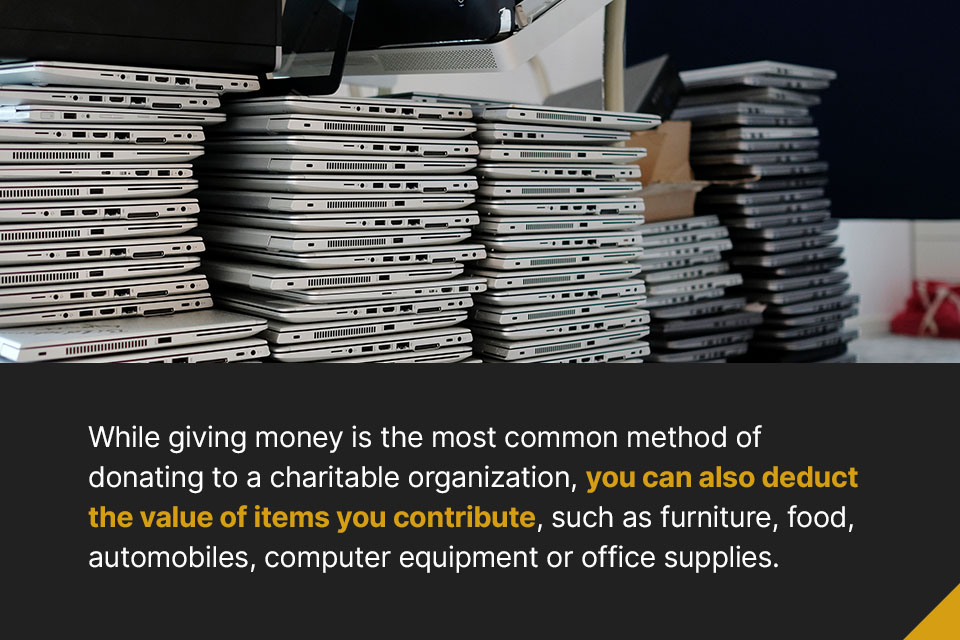 While giving money is the most common method of donating to a charitable organization, you can also deduct the value of items you contribute, such as furniture, food, automobiles, computer equipment or office supplies.